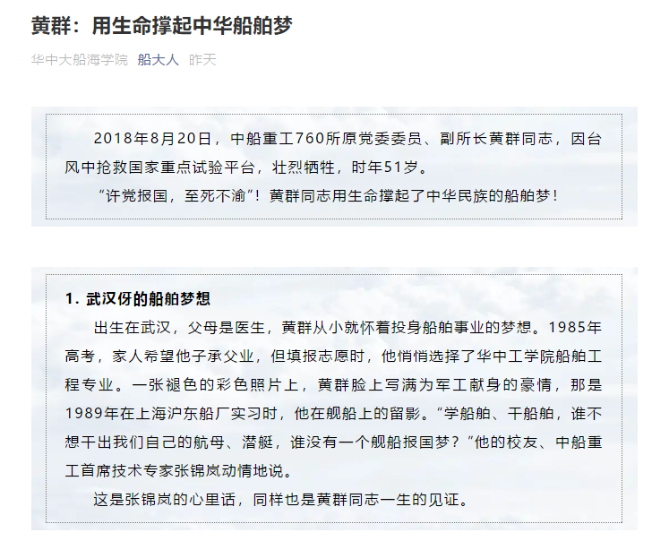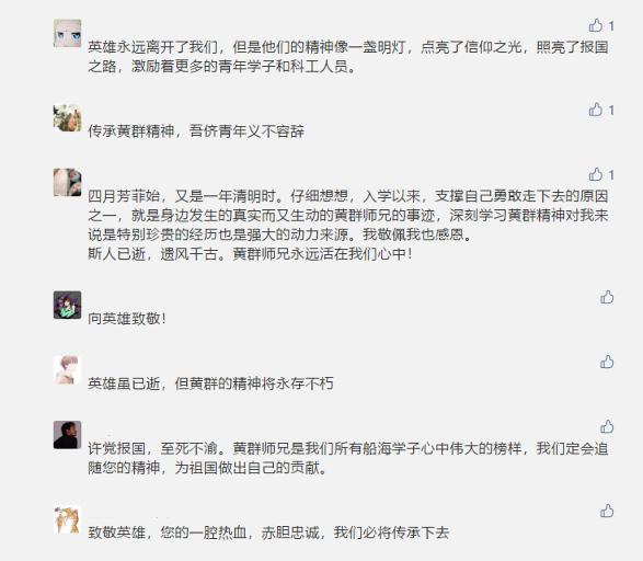 4月4日,船海学院官方公众号推送了一篇名为《黄群:用生命撑起中华船舶梦》的推文,以纪念黄群校友舍生忘死的壮烈情怀。在文章评论区,有同学留言评论道:“许党报国,至死不渝。黄群师兄是我们所有船海学子心中伟大的榜样,我们定会追随您的精神,为祖国做出自己的贡献”