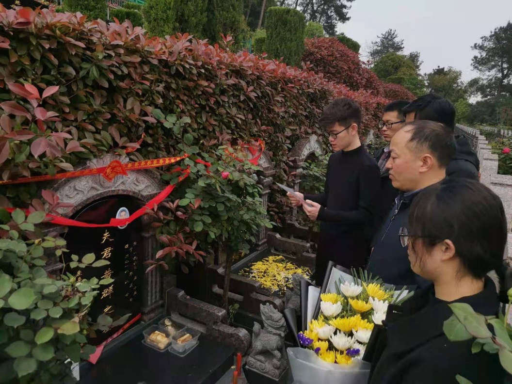 4月4日,船海学院2019级“黄群班”教师班主任刘敬喜教授、辅导员靳丰富以及本科2017级、2018级、2019级“黄群班”的6位学生代表,前往武汉蔡甸区玉笋山陵园祭奠黄群同志。在校友墓碑前,全体成员向黄群同志深深鞠躬、默哀,表达全院师生对他的深切追思与敬仰。学生代表向黄群同志墓碑敬献了鲜花,三届“黄群班”的学生代表依次诵读了他们写给黄群同志的追思信。他们在信中写道:“只有奋斗的一生才称得上幸福的一生,您放心,我们会接续您的奋斗,树立坚定信念,锤炼担当意识,培养奉献精神。”