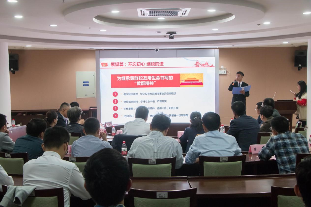 梁茜作总结讲话。他指出,对党忠诚、恪尽职守、不怕牺牲是黄群精神的集中体现。我们纪念英雄最好的形式,就是向他们学习,做像他们那样的人。船海学院深入开展“黄群班”创建活动,结合专业特色,在引导学生班级加强思想道德建设,党团建设、班风学风建设方面,在教育广大学子树立远大理想,坚守初心使命,锤练真才实学方面,做了很好的工作,要坚持做实做好。学校将以“黄群班”“胡吉伟班”“班级成长工程”为典型引路,开展“荣誉班级建设”活动,学习先进模范,学习黄群精神,做德智体美劳全面发展的合格建设者和可靠接班人。