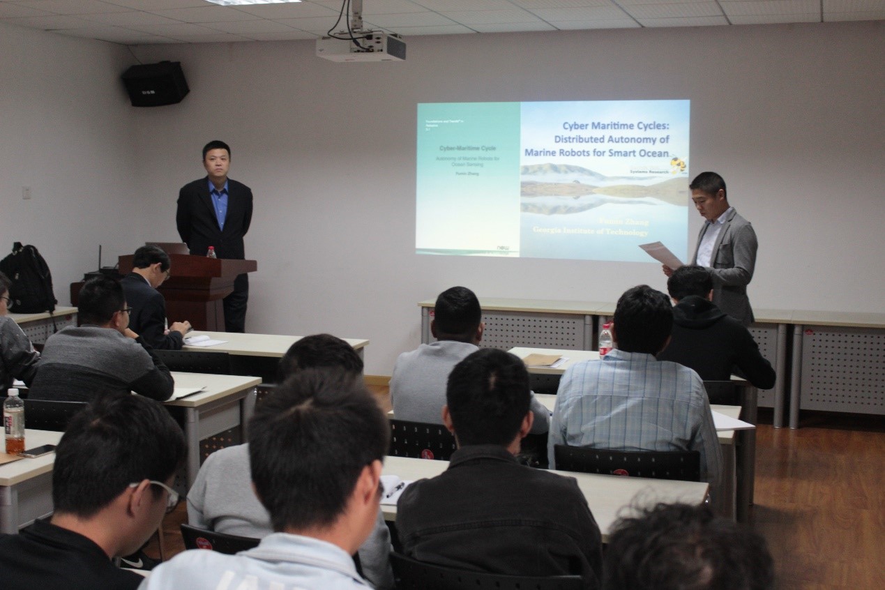 2019年11月2日下午Fumin Zhang教授受船海学院杨少龙、向先波老师邀请来访我院,并为我院师生作了题为“Cyber Maritime Cycles: Distributed Autonomy of Marine Robots for Smart Ocean”的学术报告,我院向先波教授和杨少龙老师等相关课题组老师、博士和硕士研究生参加了此次学术交流活动,会场由杨少龙老师主持。