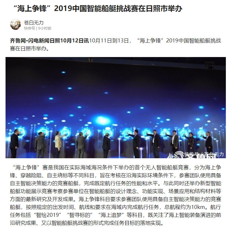 在刚刚结束的2019中国智能船艇 “海上争锋”挑战赛上,我院师生携自主研发的智能无人船“飞电绝影”号参赛,与国内众多著名高校及行业内专业无人船公司同台竞技,经过激烈角逐,我院智能无人船团队获得A/B组(自主绕标赛)亚军,并获得赛事二等奖。
