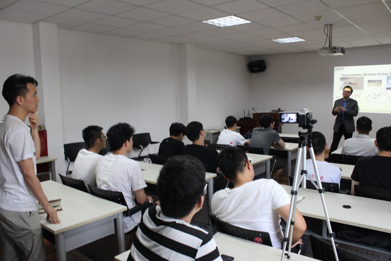 最后Shaohui Foong教授详细介绍了关于直升机与固定翼垂直起降无人机的优缺点,并根据这一思路进一步优化无人机,使其能够实现固定翼模式与旋翼模式的快速切换,兼顾两者之间的优点。Shaohui Foong教授的报告内容深入浅出,理论结合实践,报告会场交互频繁,气氛十分活跃,与会师生获益良多。