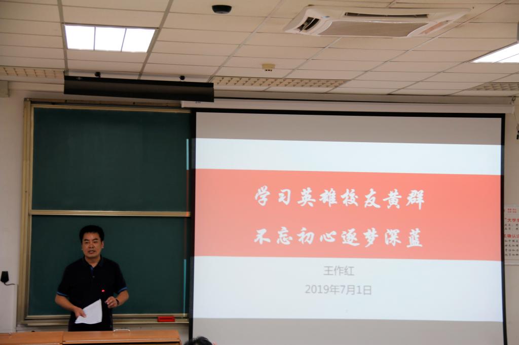 7月1号晚,东九B102,船海学院党委书记王作红以“学习英雄校友黄群,不忘初心逐梦深蓝”为主题,为全院学生党员上了一堂生动的思政课。