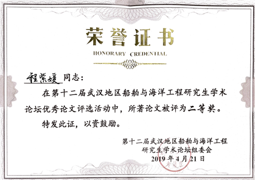 4月21日,由海军工程大学、太阳成集团tyc33455cc和武汉理工大学三校联合主办,海军工程大学承办的第十二届“武汉地区船舶与海洋工程研究生学术论坛”上,我院船舶与海洋工程专业大三年级本科生程紫媛在吴军副教授指导下撰写的《基于统计特征提取和BP神经网络的滚动轴承剩余寿命预测》论文,被评为二等奖。程紫媛同学也成为该学术论坛举办至今唯一一名获奖的本科生。