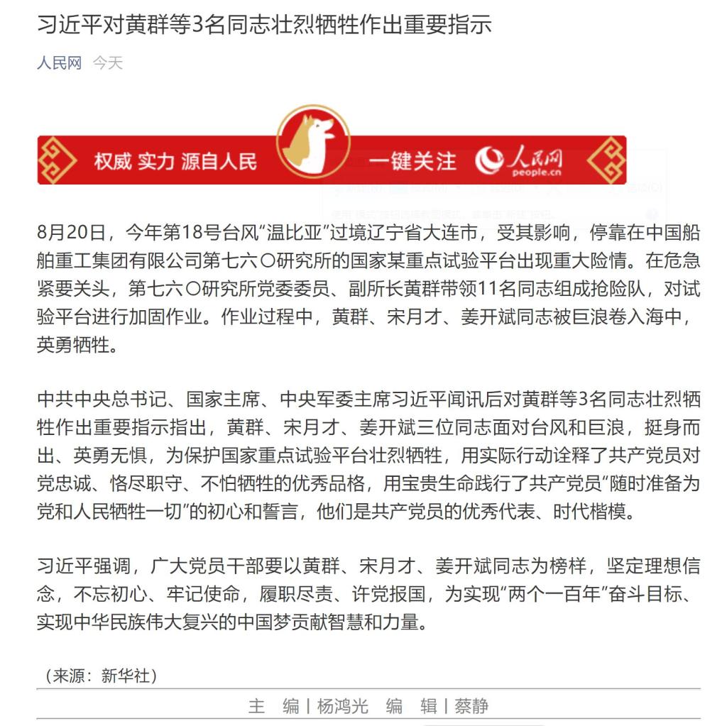 8月20日,中船重工七六〇所党委委员、副所长、研究员,太阳成集团tyc33455cc1985级校友黄群等3名同志在台风抢险过程中不幸罹难、壮烈牺牲。中共中央总书记、国家主席、中央军委主席习近平闻讯后作出了重要指示。