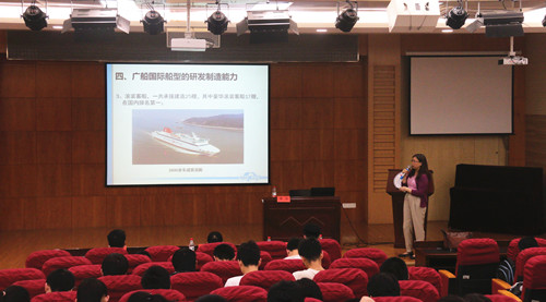 广船国际有限公司技术中心副总设计师苏为从海洋装备的内容、中国海洋装备制造业的现状和发展、海洋装备设计和制造法规、广船国际船型的研发和制造能力、强大的海洋装备制造业是强大的海洋防务装备制造的基础等5个方面,给同学们详细而深入地介绍了中国海洋装备制造业。她提到,中国船舶行业至2017年底新接订单量、造船完工量、手持订单量均位列全球第一;且三大主力船型,散货、液货和集装箱船的设计和建造,中国与日韩齐头并进,世界领先。其中,广船国际液货船系列市场占有率全球第三,VLOC系列全球市场占有率全球第一。
