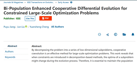 10月17日,电气和电子工程师协会期刊《进化计算》在线发表了船海学院船舶结构力学与优化设计研究所程远胜教授团队论文“Bi-Population Enhanced Cooperative Differential Evolution for Constrained Large-Scale Optimization Problems”(求解大规模约束优化问题的双种群增强协同差分进化算法)。我校为论文第一署名单位,2019级博士生江璞玉为第一作者,程远胜教授为论文的唯一通讯作者,刘均教授为共同作者。 《进化计算》期刊(IEEE transactions on evolutionary computation, 属中科院一区Top,影响因子14.3,CiteScore排名计算机理论方法第2,JIF排名计算机人工智能领域第6。