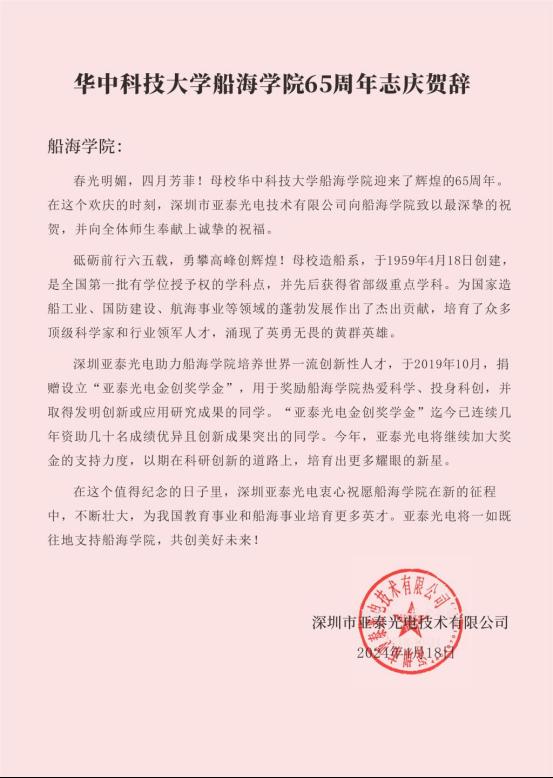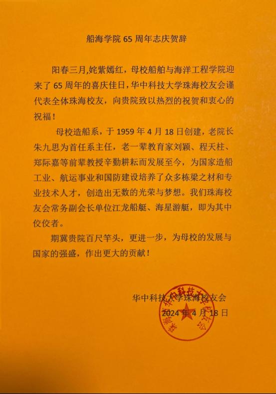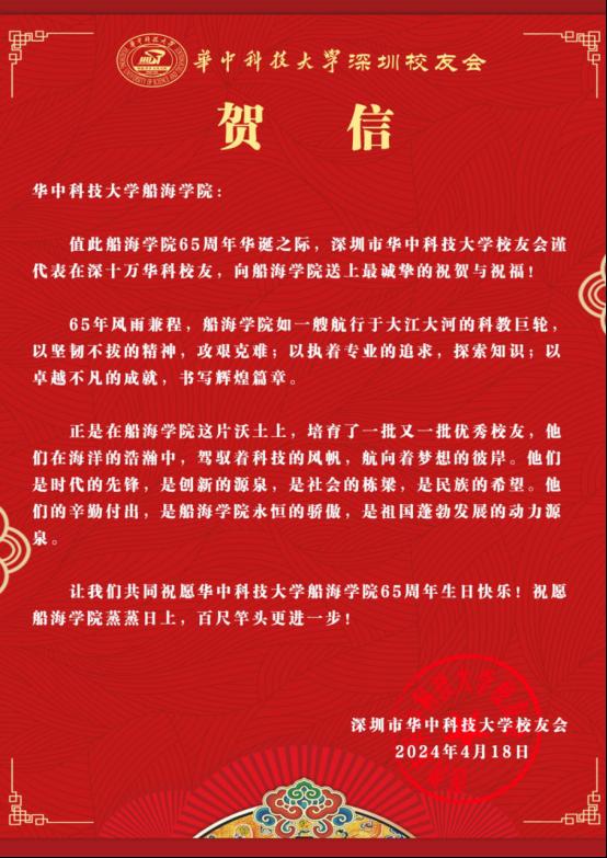 韩广德校友:热烈祝贺建院65周年!岁月如歌,风光依然,感恩学校栽培。值此院庆之际,祝学院桃李满天,英才辈出;各位师兄弟姐妹们携手共进,为船海学院发展共同出力!看今朝桂花香飘华科,看明日船院再创辉煌!