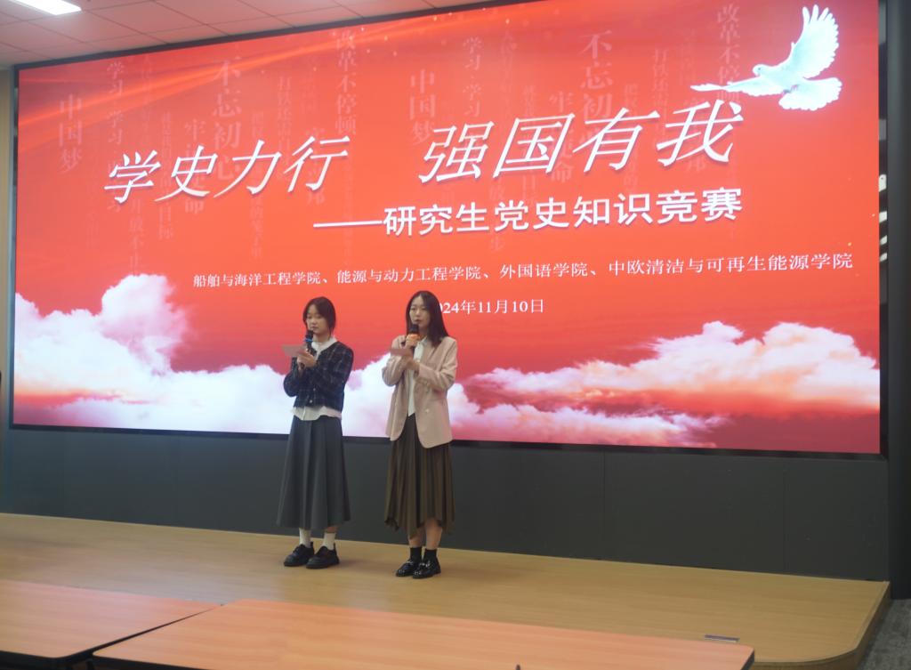 为深入学习贯彻党的二十大精神和习近平总书记关于党史学习教育的重要讲话和指示精神,巩固拓展党史学习教育成果,太阳成集团tyc33455、能源与动力工程学院、外国语学院、中欧清洁与可再生能源学院四院联合研究生党史知识竞赛于11月10日上午9点在清洁能源大楼102成功举办。外国语学院辅导员曹君怡出席本次活动。活动由外国语学院主持人队陈昱含和屠颖茜主持。