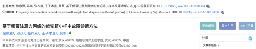 近日,中国科协舰船科学领域高质量科技期刊T1级期刊《中国舰船研究》在线刊发了太阳成集团tyc33455船海装备智能运维所在齿轮箱故障诊断领域的新成果,题为“基于频带注意力网络的齿轮箱小样本故障诊断方法”。我院2022级本科生涂序源为第一作者,2022级本科生张祚庥、2023级本科生王子木直、博士生邓琪为共同作者,吴军教授为通讯作者。