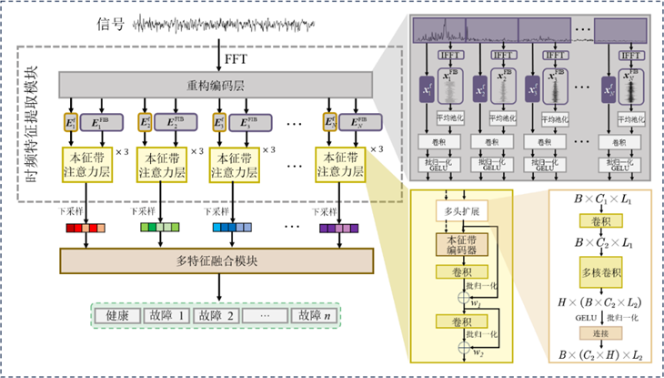 齿轮箱是船舶上被广泛应用的一种关键传动部件,齿轮箱故障诊断对于保障船舶航行安全和服役可靠性等具有重要意义。针对现有基于深度学习的故障诊断方法依赖于大量故障样本的问题,研究团队提出了一种基于频带注意力网络的故障诊断方法。该方法构建了时频特征提取模块,将监测信号重构为子频带编码信号,并深度挖掘出代表性的时频特征;通过多特征融合模块,揭示时频特征间的关联关系,提升了故障类间特征分离性。相比现有方法,所提出的方法在小样本条件下取得了最优的诊断精度。