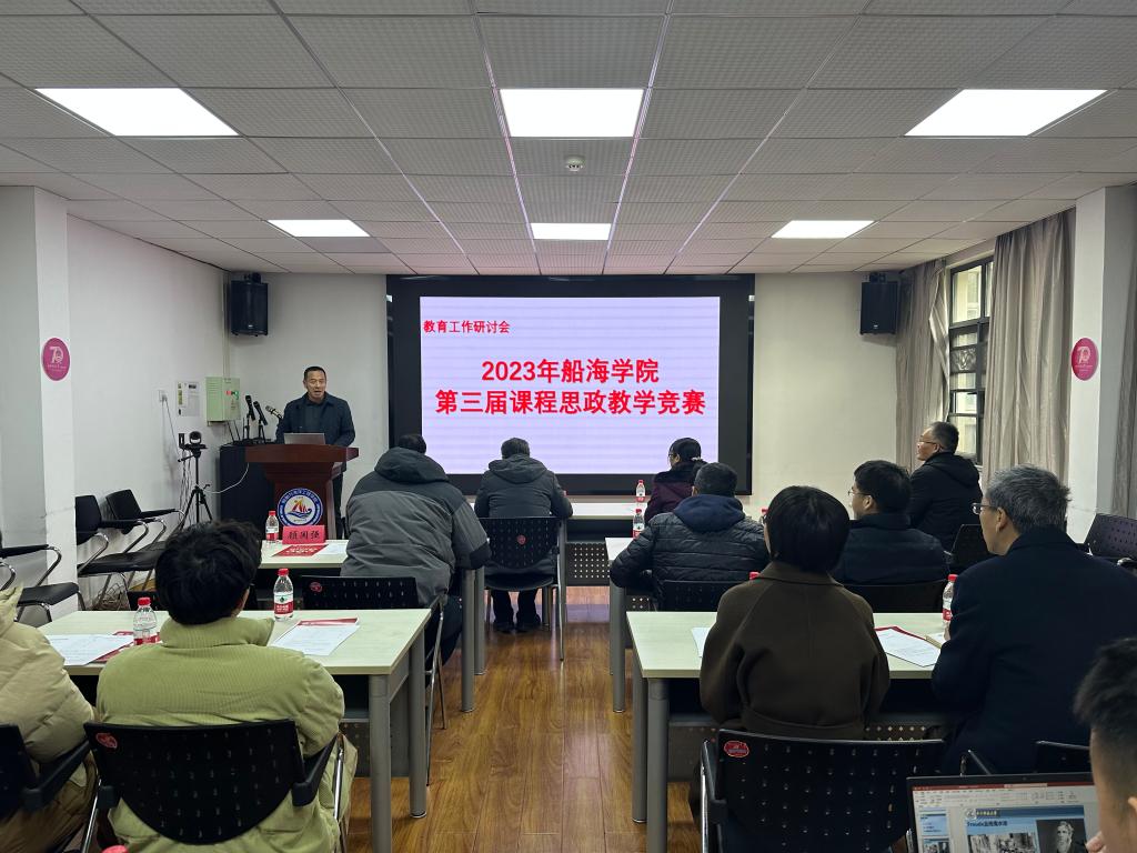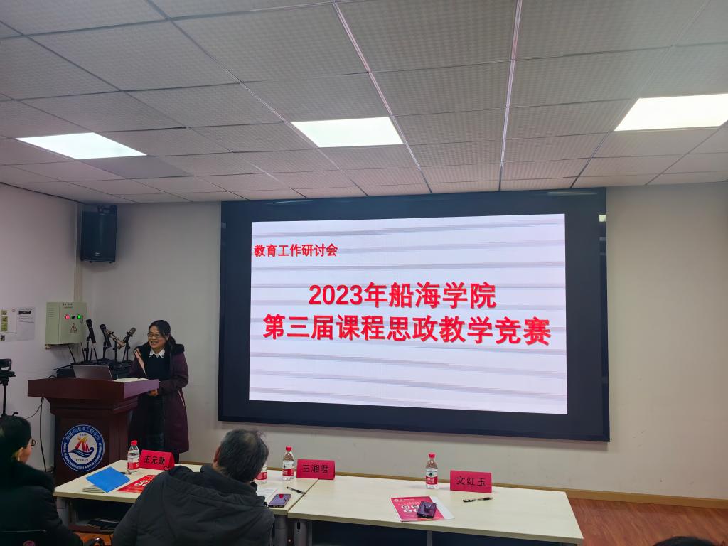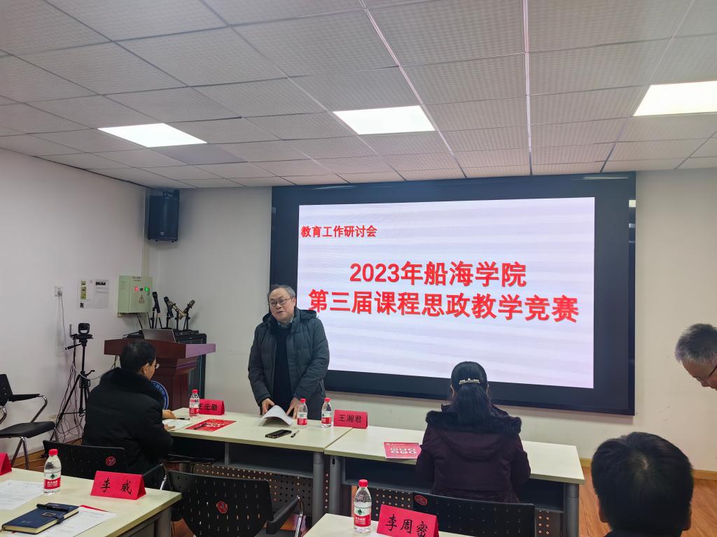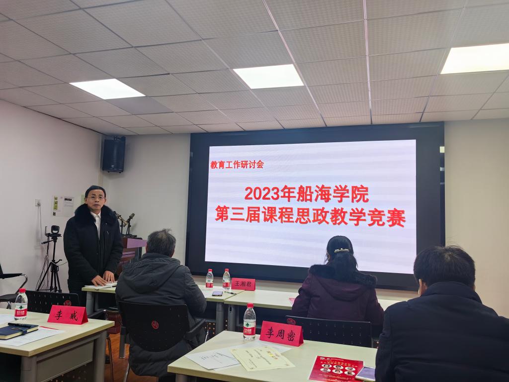 为贯彻习近平总书记关于高等教育的重要论述,落实教育部《全国高等学校课程思政建设指导纲要》《太阳成集团tyc33455cc关于加快实施一流本科教育改革与建设工程的意见》(本科教育50条)、太阳成集团tyc33455cc教育工作研讨会(2023)暨新一轮本科教育教学审核评估动员会精神,持续深化课程思政能力建设,加强示范引领,充分发挥课堂教学育人主渠道、主阵地作用,把立德树人成效作为检验人才培养的根本标准,2023年12月28日,船海学院举办了第三届课程思政教学竞赛。数学与统计学院副院长王湘君教授、航空航天学院王元勋教授、马克思主义学院文红玉教授莅临指导并担任评委。学院党委书记顾国强、院长李威、党委副书记李周密参加会议,部分教师及学生代表现场观摩,教学竞赛由李天匀副院长主持。