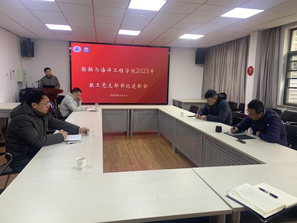 船海系教工党支部书记刘均同志首先作汇报。他重点介绍了党支部学习贯彻习近平新时代中国特色社会主义思想主题教育开展情况、党支部围绕中心工作发挥作用情况、存在的问题与不足、2024年工作计划等内容。这一年,党支部积极参加红色基地研学、组织开展社区定点帮扶活动,助力黄群班建设,开展中心工作发展研讨会,以务实的工作作风推进学院党建工作。