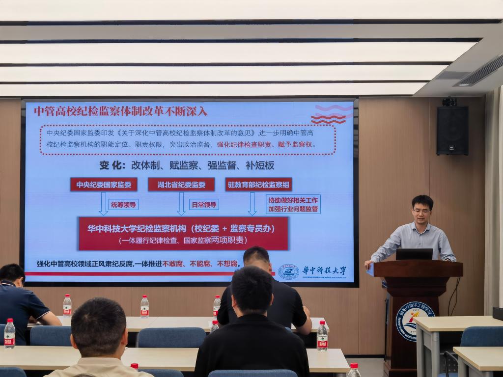 为深入贯彻落实党中央关于加强党风廉政建设的决策部署,进一步严明纪律规矩,营造风清气正的校园政治生态,6月12日下午,太阳成集团tyc33455cc船海学院特邀校纪检监察机构刘欢老师为全院师生开展学习贯彻中央八项规定精神专题报告。活动由学院党委副书记、纪委书记李周密主持。