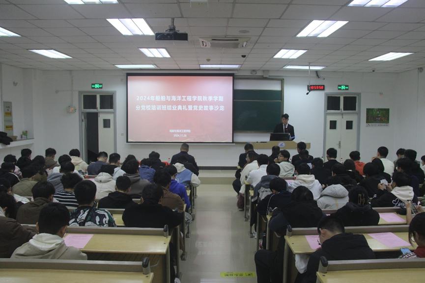 11月28日周四晚,船海学院党校培训班结业典礼暨党史故事沙龙在东九楼 B101 隆重举行。船海学院全体学生党支部书记、新发展入党的29名预备党员、第十七期发展对象培训班结业的27名发展对象、和大一大二选派的入党申请人和积极分子代表等近百名学生参加活动,船海学院党委书记、分党校校长顾国强,船海学院党委副书记、分党校副校长李周密出席会议。