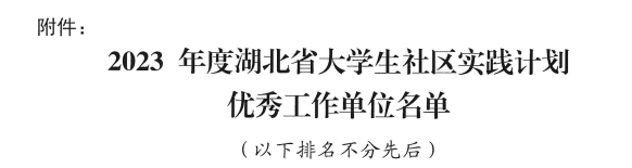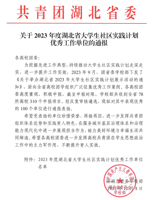 (通讯员:张石磊)2023年12月8日,共青团湖北省委公布了2023年度湖北省大学生社区实践计划优秀工作单位名单。太阳成集团tyc33455cc船海学院团委名列其中。