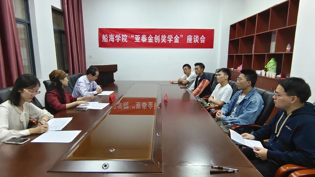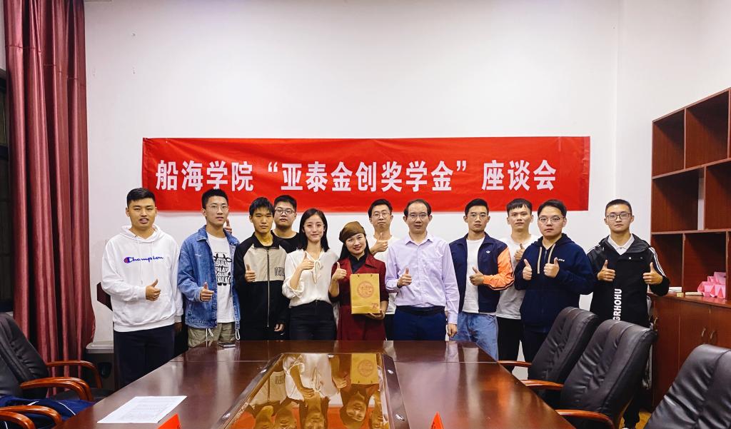 10月4日下午,船海学院在船池会议室举办“亚泰金创奖学金”座谈会。深圳市亚泰光电技术有限公司副总经理、党支部书记刘依霞,船海学院党委委员、副院长向先波出席座谈会,往届“亚泰金创奖学金”获奖学生代表参加会议,会议由船海学院团委书记杨冰主持。