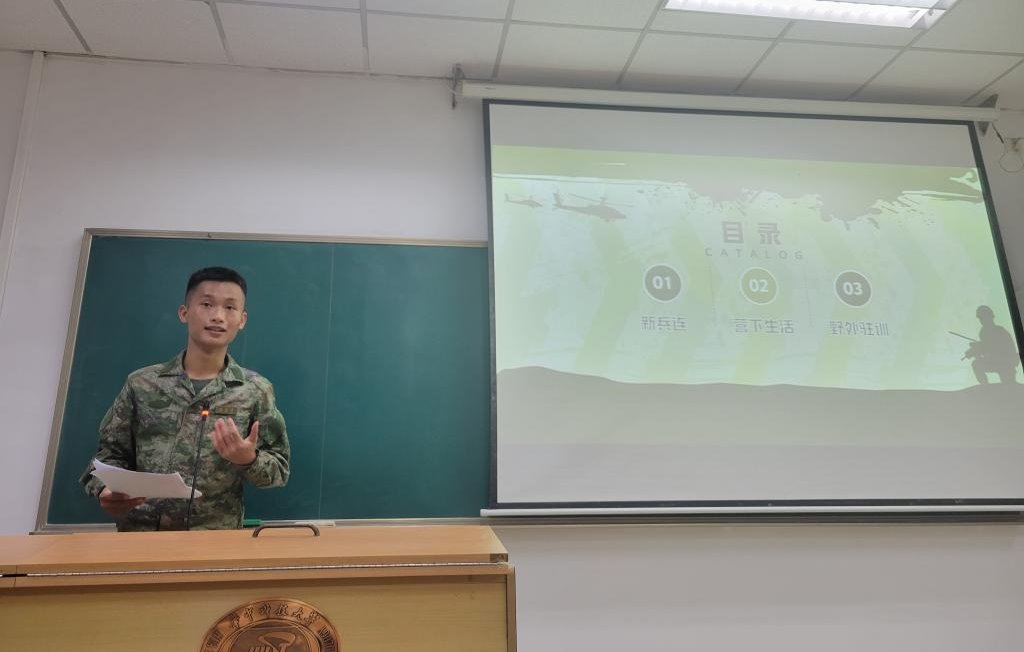 船海学院两位退伍大学生吴南磊、符昌君分别与同学们分享了自己的部队生活。他们通过视频和图片解说相结合的方式讲述了自己初入新兵连、营下生活和野外驻训等故事,结合自身经历分享了在部队锻炼两年的心得体会,鼓励同学们响应祖国号召,踊跃报名参军。